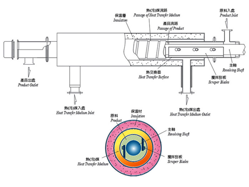 The cylinder through which material contains a revolving shaft and is jacketed. The material is forced through the narrow annular passage between the cylinder and the shaft while heat transfer medium (steam, hot water, Dow-Therm etc. for heating, and cooling water, brine, freon or ammonia etc. for cooling) passes through the jacket and performs heat exchange.